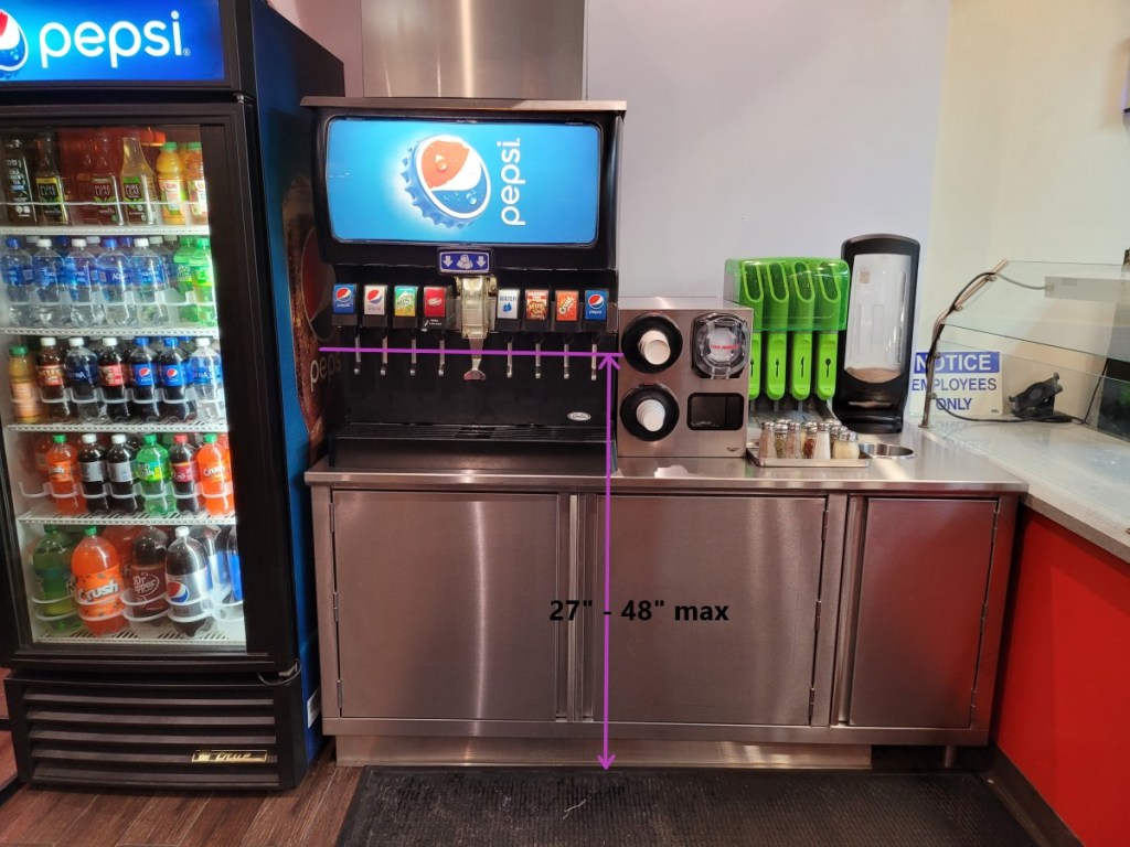 Note that the height in the above picture is measured from the floor to the soda dispenser lever or button (which is the operable part in most machines). So, it is essential to have a beverage table of lesser height. If you use modern touchscreen dispenser machines like Pepsi Spire or Coke Freestyle, they should also follow ADA height requirements. But the touchscreen interface itself has its operability requirements, and you should check with your beverage machine vendor for its ADA compliance. Also, the 48″ max height requirement becomes 46″ when the dispenser or other items like condiment organizer are placed off the table edge by 10″ to 24″.