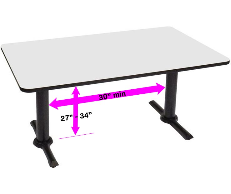 The wheelchair-accessible table uses the two bases/leg, as shown below. Using a single base table would block the wheelchair leaving not enough knee clearance. Ensure you have 30″ minimum clearance between the two legs and height is within the range 27″ – 34″, as shown in the picture. At least one wheelchair-accessible table for every 20 tables should be provided.