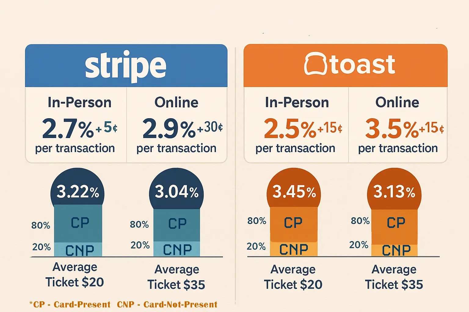- For low to mid ticket sizes ($5–$35), Stripe is generally more cost-effective than Toast, particularly with any significant online transaction volume.