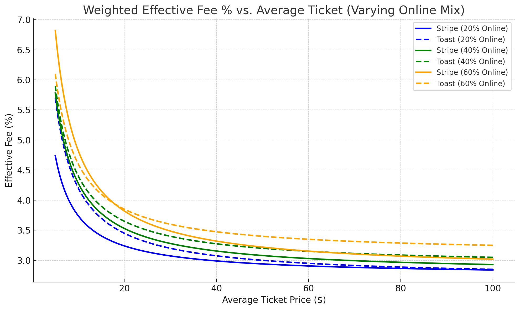 Based on the graph above, Stripe (Card-Present aka In-Person) is generally cheaper than Toast (In-Person) across most average ticket prices, especially under $50. Conversely, Toast (Card-Not-Present aka Online) offers lower fees than Stripe (Online) for smaller ticket sizes (below $25), but Stripe becomes more cost-effective for online payments at higher amounts. Still, the effective fee alone doesn’t tell the whole story—the mix of in-person and online transactions also plays a critical role. Let T represent the average ticket size. We’ll analyze each provider assuming an 80% in-person / 20% online mix. Your online share may be higher if you have a strong digital presence, e.g., with PieConnect’s tools.